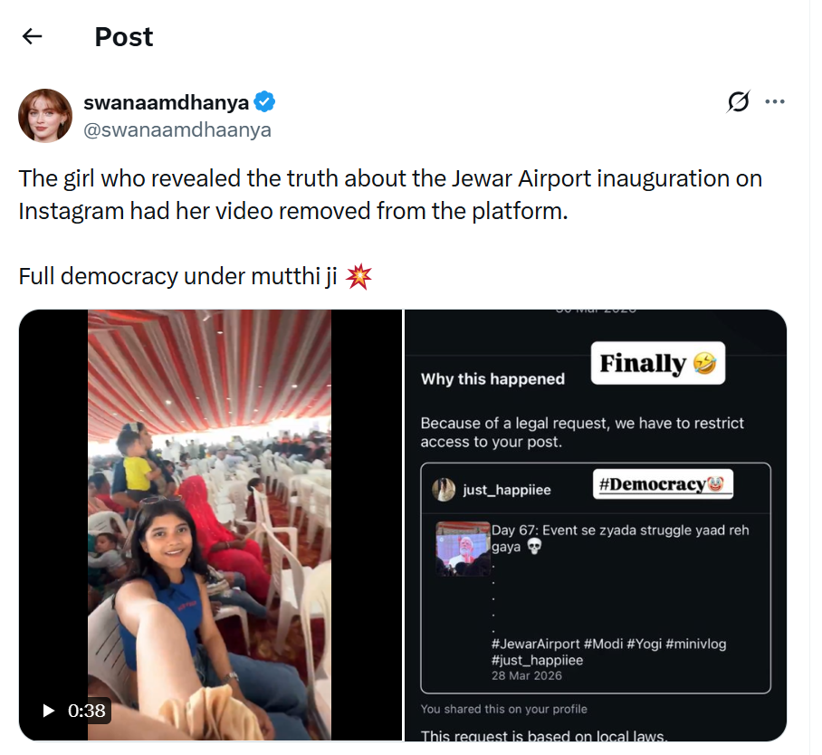 This isn’t about one airport or one reel. It’s about a government so terrified of its own people seeing the truth that it leans on Big Tech to play censor. One girl’s video rattled them more than the opposition ever could. If they’re this scared of a teenager with a camera, imagine how fragile the whole “world’s largest democracy” act really is. Mutthi ji, the delete button isn’t a leadership strategy.