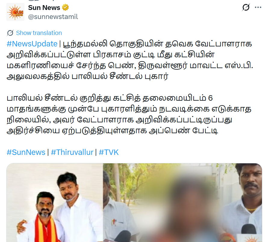 Just when election momentum begins to build, controversies like this have the power to shake public perception — and this one is already raising uncomfortable questions. In the Poonamallee constituency, the recently announced TVK candidate Prakash Kutty is now facing a serious allegation from within his own party ranks. A woman associated with the party’s women’s wing has reportedly filed a sexual harassment complaint against him at the Tiruvallur district SP office.