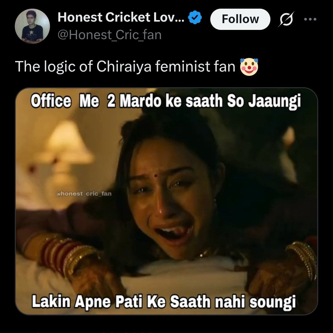 Feminist-Bashing Specials and cricket JokesAnother gem: “Office mein do mardo ke saath so jaaungi, lekin pati ke saath nahi.” (I’ll sleep with two random guys at work, but not my husband.) Or the classy cricket version – “Everyone gets a flat track, but we gave her a bowling track without asking for consent,” while she sobs in a CSK jersey. Because nothing says comedy like reducing rape to a sports metaphor. This isn’t “just online trolling.” It’s a public confession. These memes aren’t laughing at the scene – they’re laughing at the woman, at the trauma, at the very
