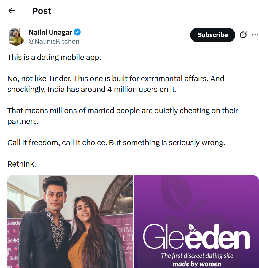 No fuzzy “finding love” marketing here. This platform exists for one reason: helping married men and women hook up without getting caught. Profiles, chats, secret meet-ups – all designed to make cheating as easy and “safe” as ordering food on Zomato. And we’re lapping it up. 4 Million Traitors Walking Among Us