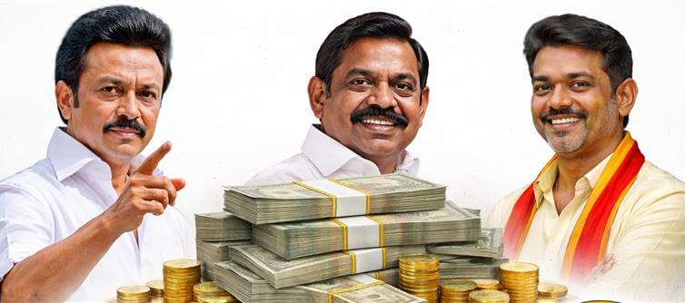 election season in tamil Nadu has turned into a high-stakes bidding war—and the numbers are staggering. Welfare promises are getting bigger, bolder, and far more expensive. But behind every freebie lies a critical question: who’s footing the bill? As parties compete to outdo each other, the financial burden of these promises is quietly climbing into tens of thousands of crores.