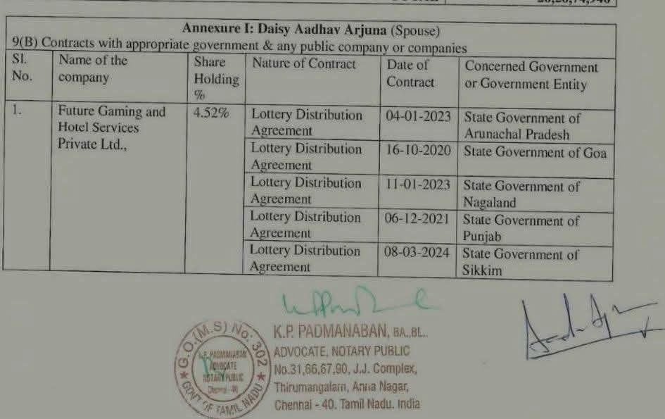 Direct blood link to the ultimate scam artist: He is married to Santiago Martin’s daughter. The same Martin whose empire is drowning in ED, CBI, and IT probes for allegedly cheating sikkim of thousands of crores, rigging lottery draws, laundering money through shell companies, and grabbing land. ED even raided Arjuna’s own premises along with Martin’s in 2024. Blood is thicker than ethics, clearly. ₹197 crore assets that scream questions: How does a career party-hopper who jumped from VCK to TVK (his third flip in under a year) suddenly declare nearly 200 crore in wealth? While ordinary Tamils struggle with inflation and joblessness, this guy’s affidavit reads like he hit the jackpot — or inherited one from daddy-in-law’s dirty lottery empire.