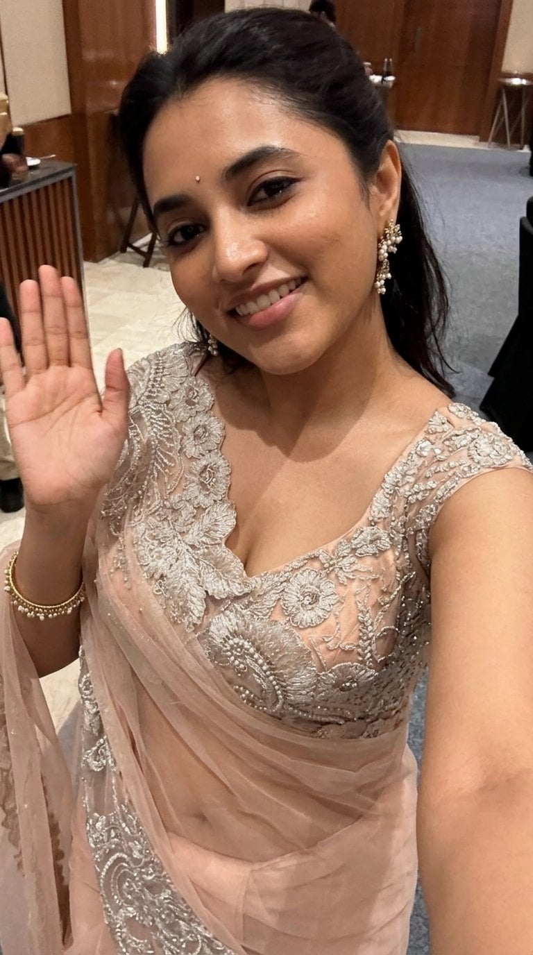 The second selfie captures her playful side: big, radiant smile lighting up the frame, one hand waving hello while the other snaps the perfect close-up. The deep neckline and sparkling embroidery pop against her skin, highlighting her natural beauty and confidence. Whether poised and enigmatic or warm and approachable, priyanka proves once again why she’s a fashion icon in tamil and telugu cinema. This peach saree moment isn’t just a look — it’s a statement of pure star power!