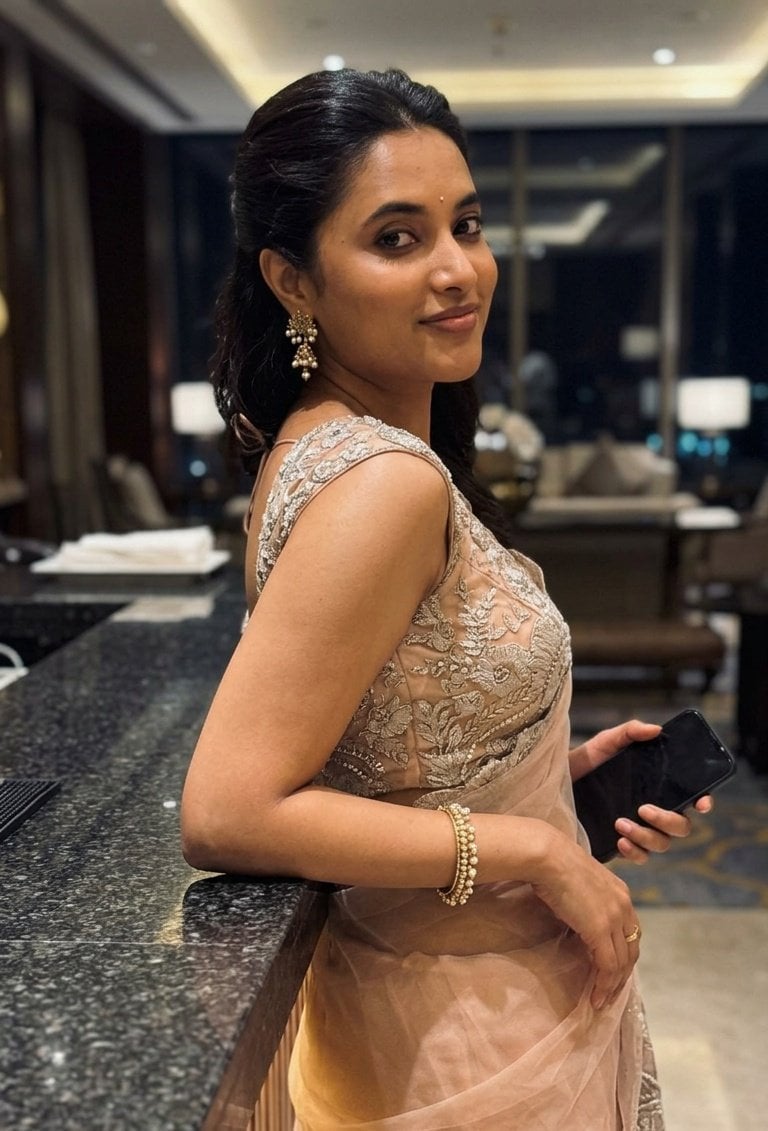 In the first shot, priyanka leans gracefully against a sleek black marble bar in a luxurious hotel lounge, her body turned slightly away as she glances back over her shoulder with a soft, mysterious smile. Her sleek updo falls into soft waves, accentuating her sharp jawline and the heavy gold jhumka earrings dripping with pearls. A subtle bindi, glowing makeup, and stacked pearl bangles complete the look as she holds her phone casually — the ultimate blend of sophistication and effortless cool.
