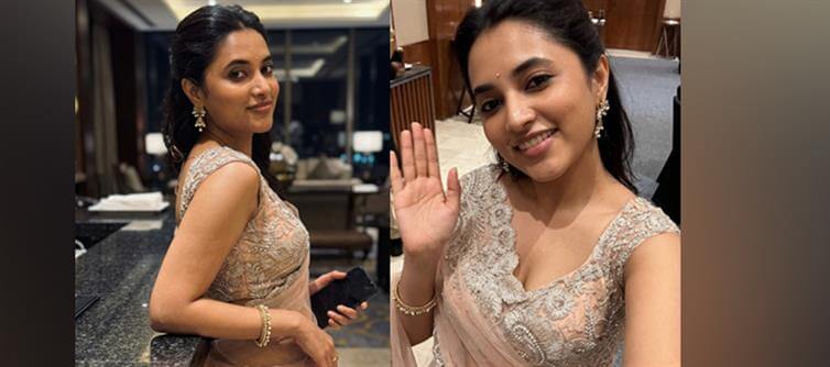 Priyanka Mohan (Priyanka Arul Mohan), the radiant South indian star of hits like Doctor and Don, is serving absolute ethereal elegance in these two breathtaking images. Draped in a dreamy peach-nude sheer saree with intricate silver floral embroidery, beads, and sequins, she exudes timeless glamour with a modern twist. The sleeveless blouse hugs her figure perfectly, showcasing delicate zari work that catches the light with every movement, while the flowing drape reveals just enough skin for that irresistible allure.