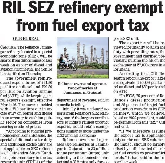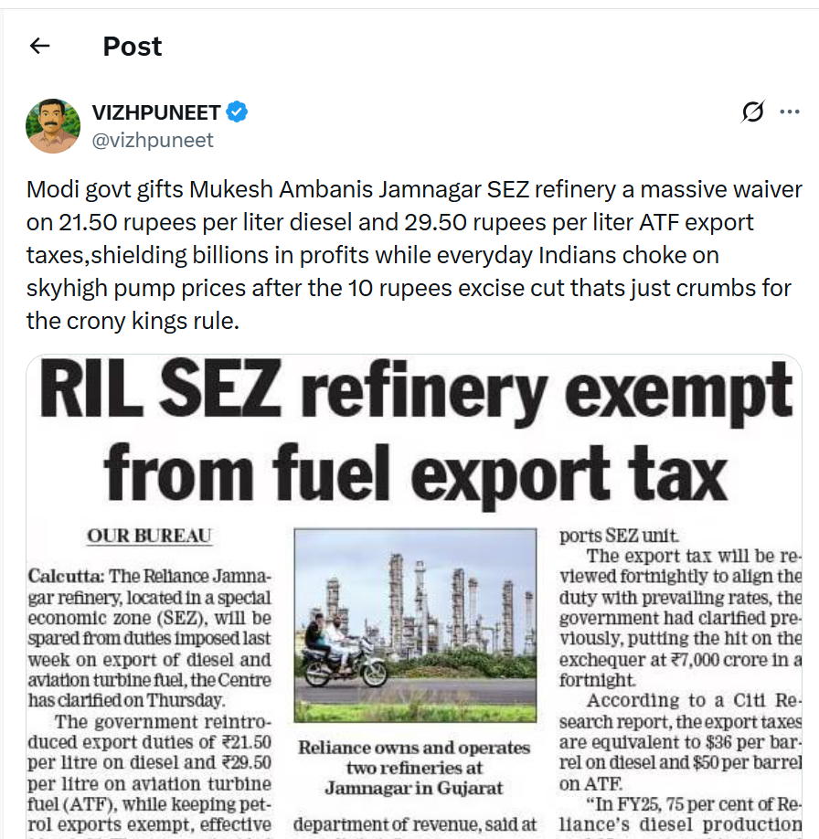 While the rest of us are still reeling from sky-high diesel and petrol prices at the pump, the government slapped export taxes of ₹21.50 per litre on diesel and ₹29.50 per litre on ATF… and then immediately exempted Ambani’s refinery from paying a single rupee of it.