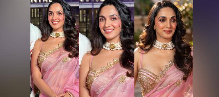 Kiara Advani is serving pure desi glamour with a dangerously seductive twist in these breathtaking images. Draped in a sheer, blush-pink saree with intricate gold sequin work and scalloped borders, the actress looks like a modern-day goddess wrapped in liquid silk. The fabric clings teasingly to her curves, revealing just enough to set hearts racing while maintaining that perfect balance of elegance and sensuality. Her long, voluminous black waves cascade over one shoulder, framing her radiant face. A bold
