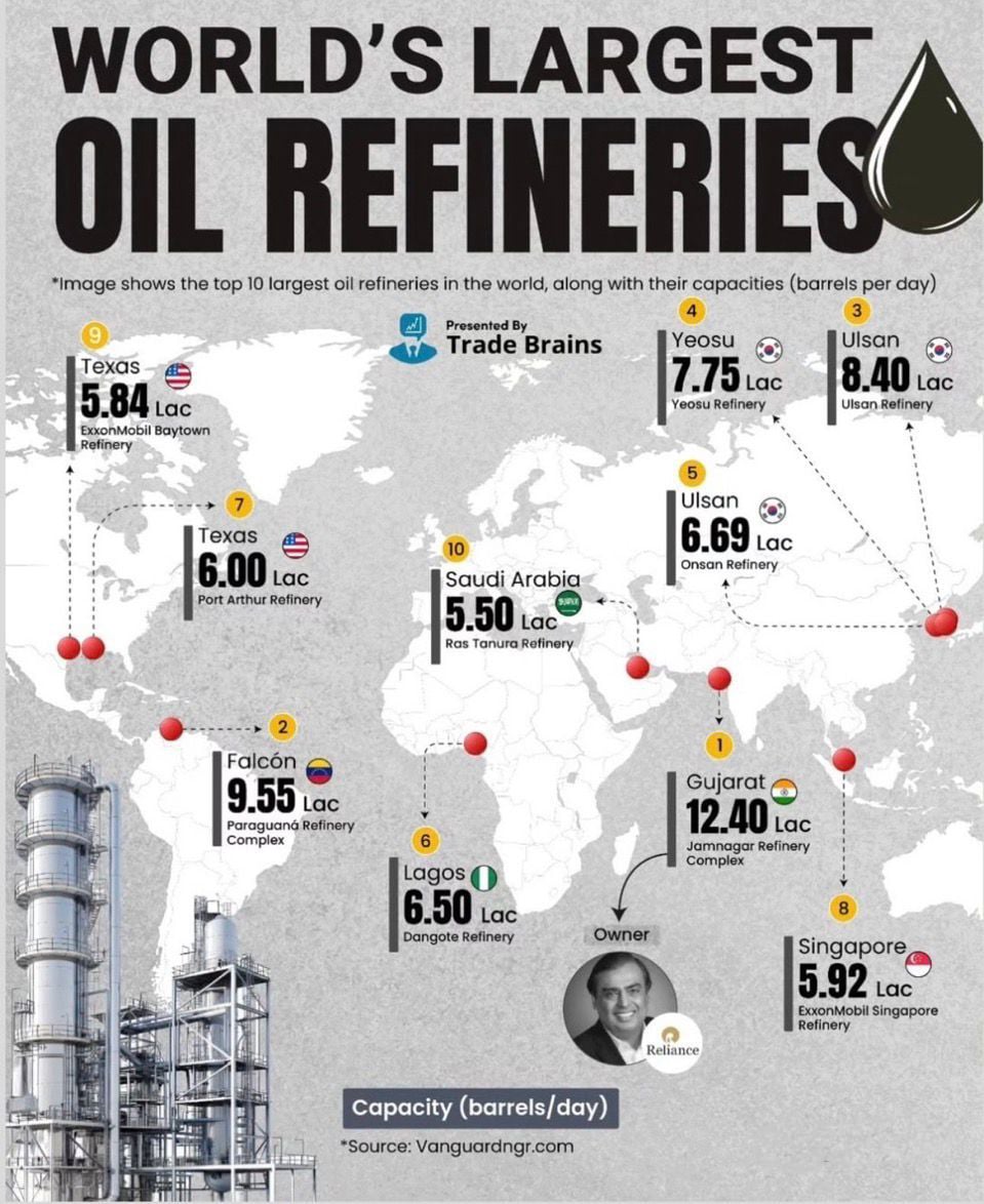 Start with India. The Jamnagar refinery isn’t just big, it’s on another scale entirely. Processing around 1.24 million barrels a day, it stands as the largest refining complex on the planet, a giant that quietly fuels economies far beyond its borders. It’s not just infrastructure, it’s influence.