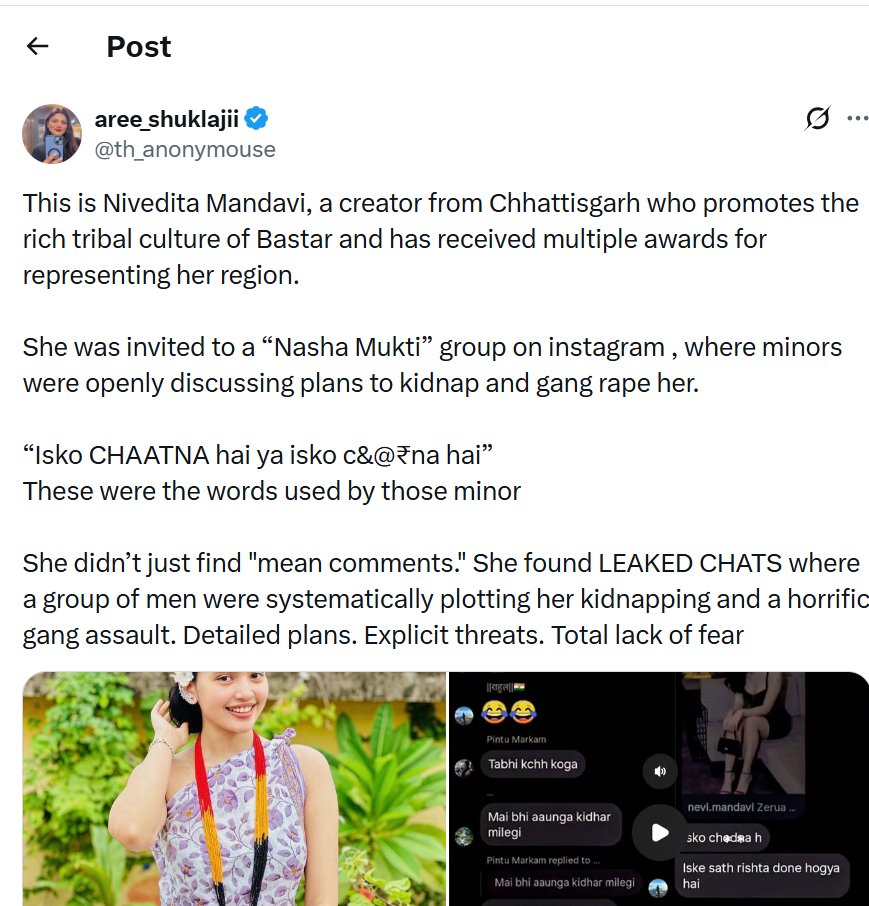 Nivedita, a creator from chhattisgarh known for showcasing Bastar’s tribal culture, has built her voice around identity, tradition, and representation. But what she encountered recently had nothing to do with disagreement or criticism. It crossed into something far more serious and deeply unsettling.