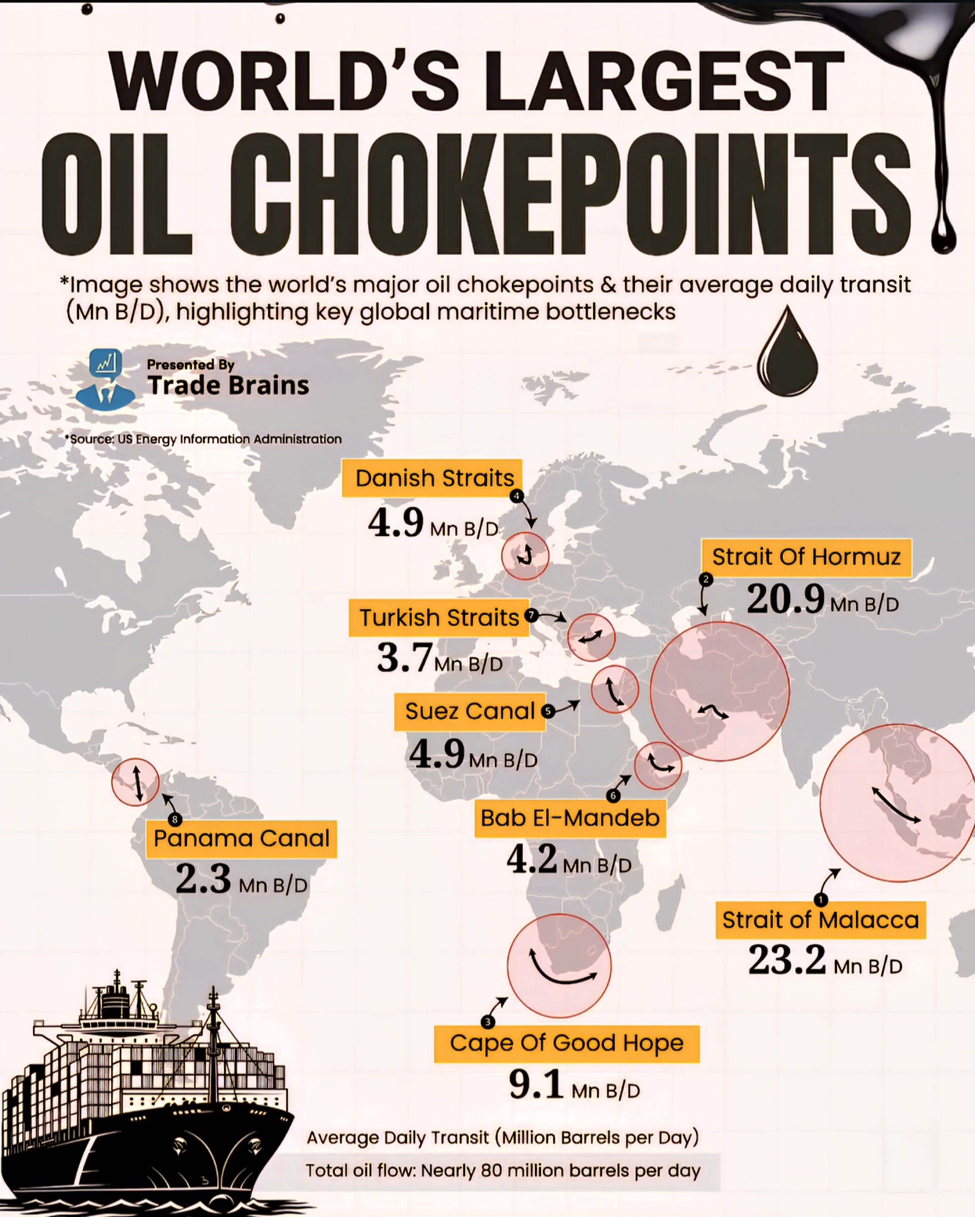 And that’s the bigger picture. Out of roughly 80 million barrels of daily global oil flow, a huge portion depends on just these few narrow passages. It’s a system built on efficiency — but also on fragility.