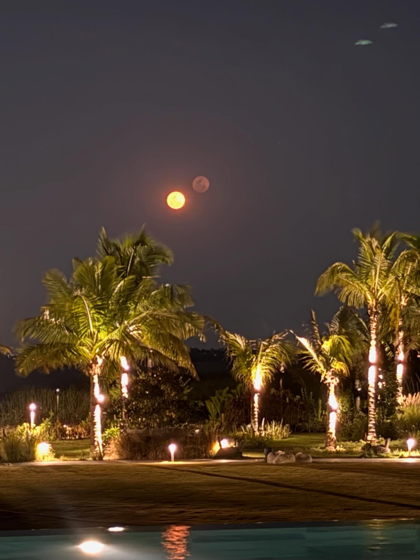 The second set of images shifts gears. A blue striped two-piece, poolside setting, sunlit villa in the background—suddenly it feels like a luxury editorial. Wet hair, sun-kissed skin, and a relaxed pose elevate the entire frame.