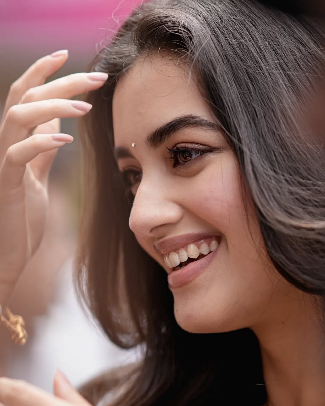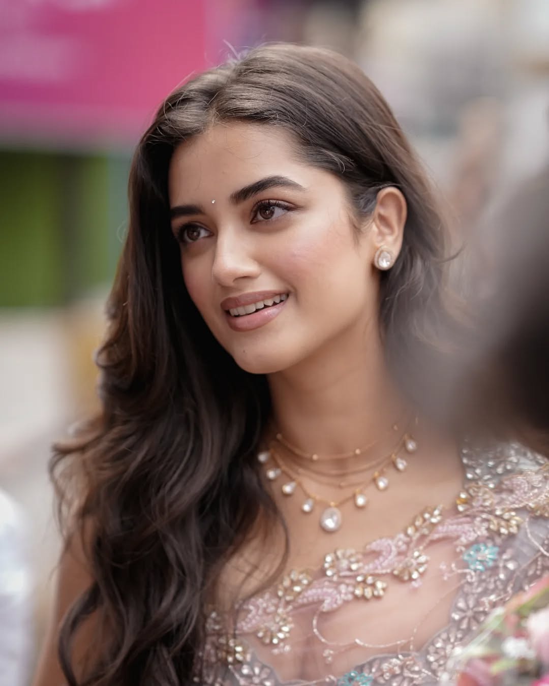 Her long, voluminous dark waves cascade beautifully over one shoulder, framing her expressive face. A dainty bindi