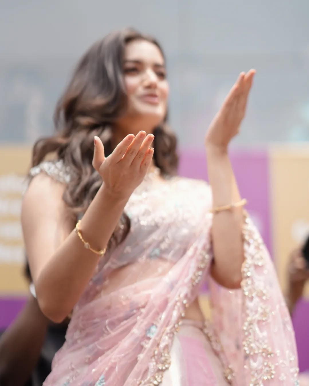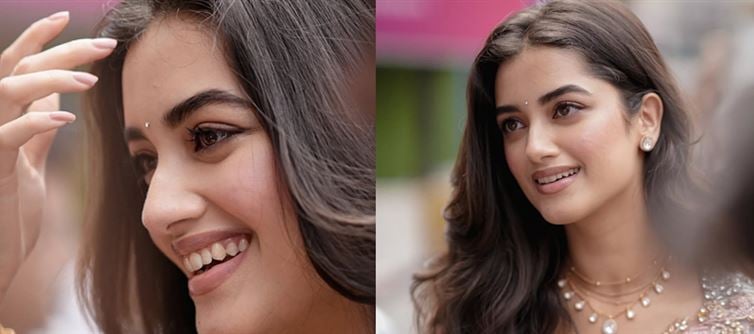 makeup — defined kohl-lined eyes, glowing skin, and a soft nude-pink lip — enhances her natural beauty. Whether flashing a wide, heart-melting smile that shows off her perfect teeth or playfully blowing a kiss with both hands,