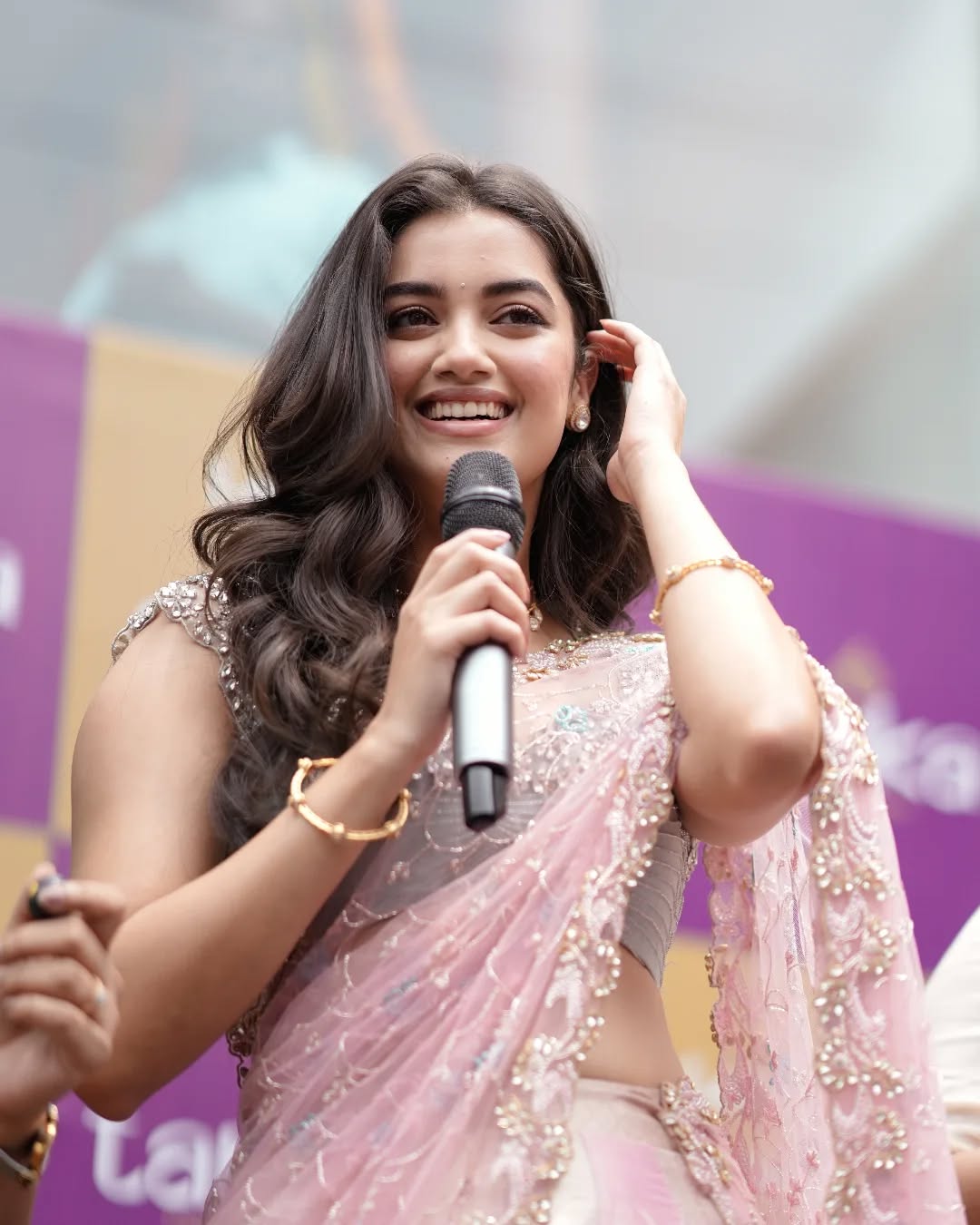 In one frame, she’s caught mid-laughter with her hand gracefully touching her hair; in another, she holds a microphone, clearly owning the stage. The layered pearl and