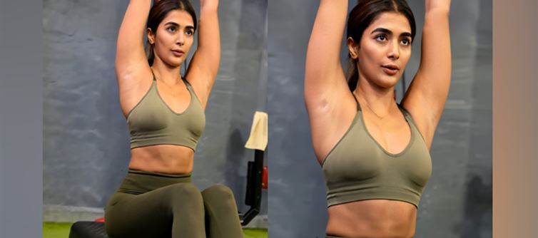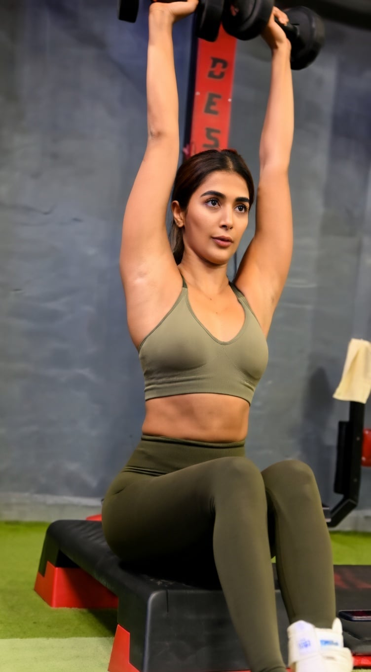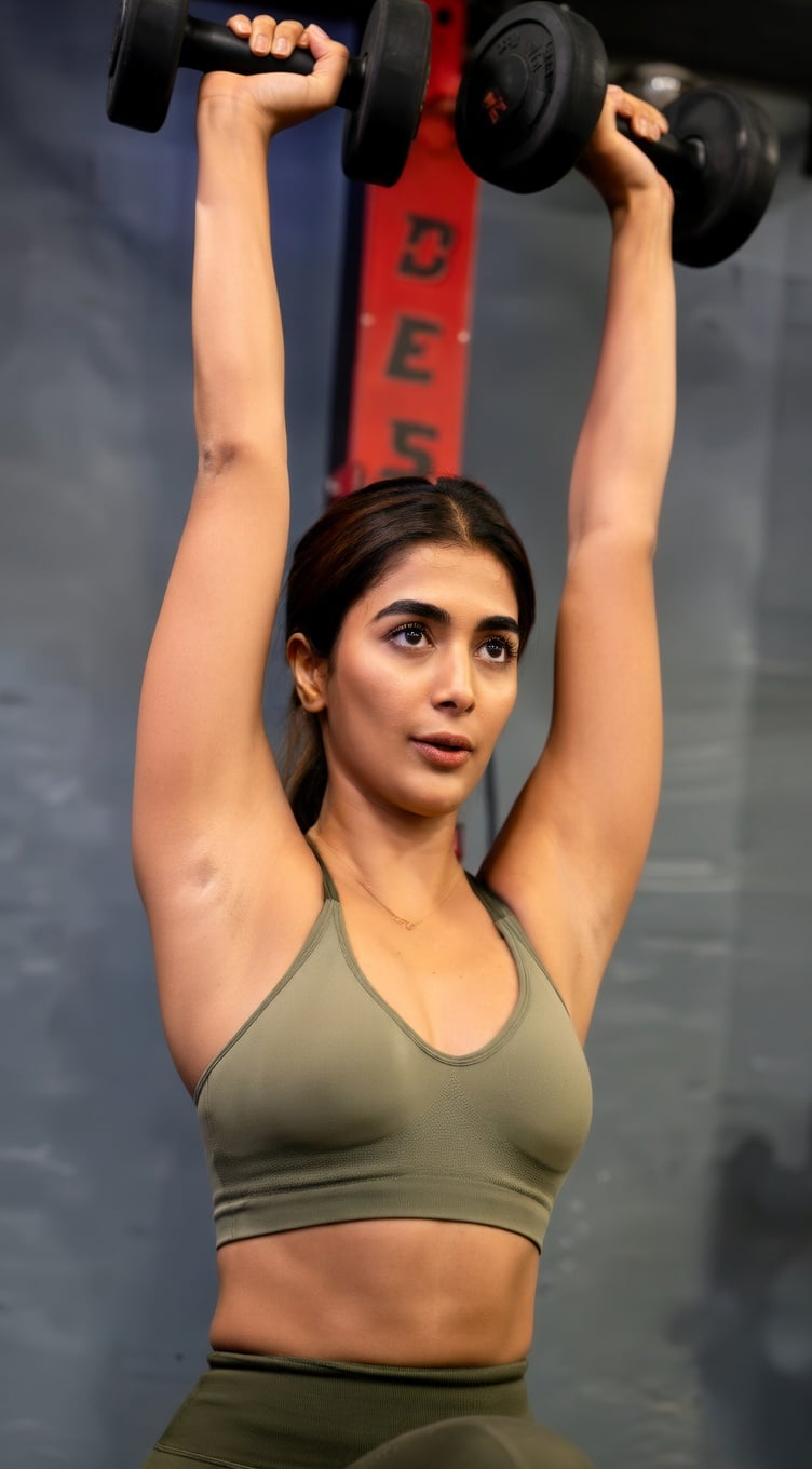 Pooja Hegde transforms a simple gym session into a breathtaking display of strength, sensuality, and star power in these stunning frames. In the close-up shot, she powerfully presses heavy black dumbbells overhead, her toned arms fully extended, showcasing sculpted shoulders and defined triceps.