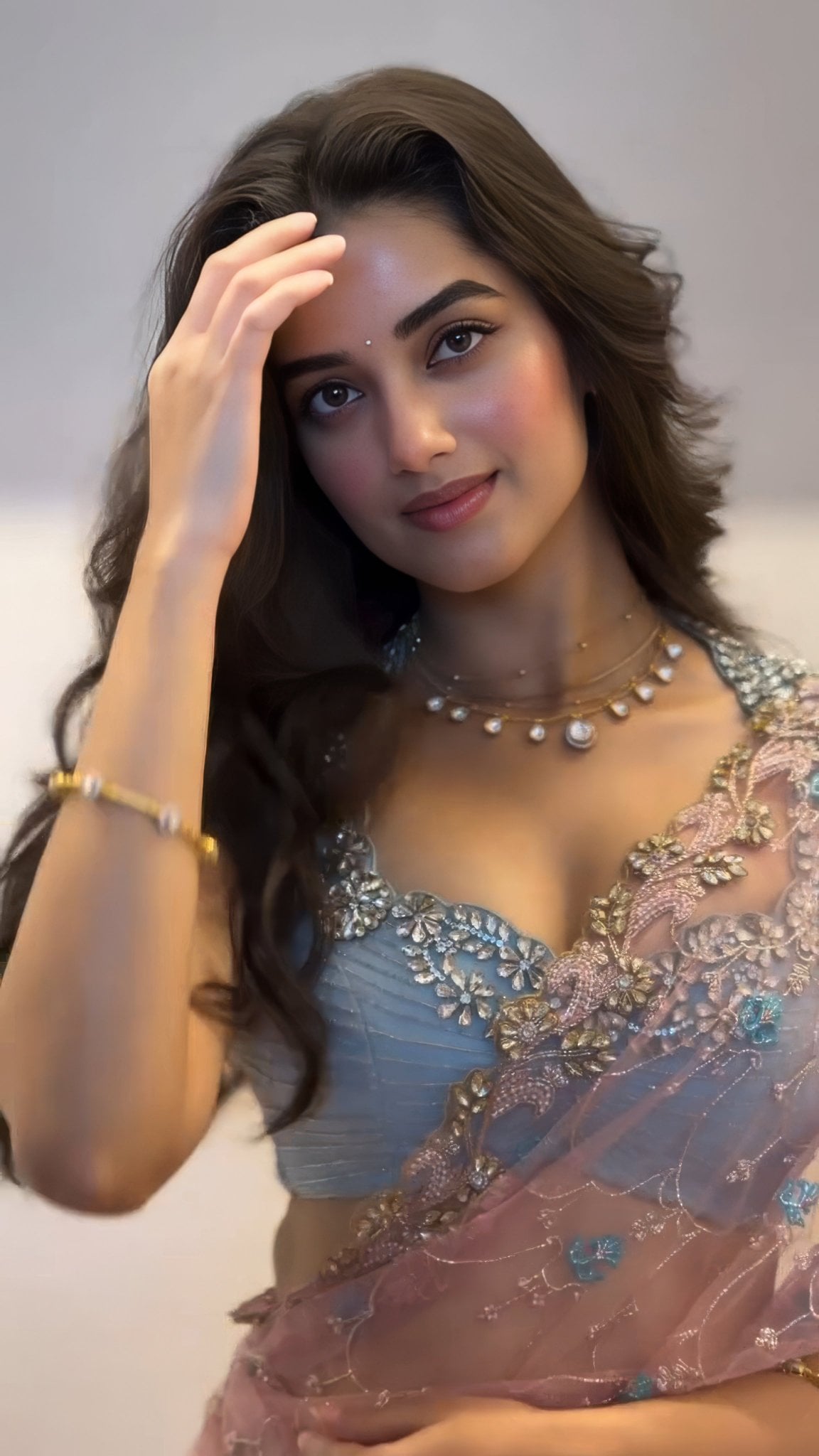 pink dupatta with turquoise accents drapes seductively over one shoulder, adding a soft, feminine touch to the bold silhouette. Her long, voluminous wavy hair cascades effortlessly, framing her striking face with bold brows, a delicate bindi, and sultry kohl-lined eyes that gaze directly into the camera with quiet confidence and subtle mischief.