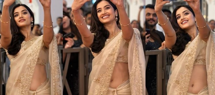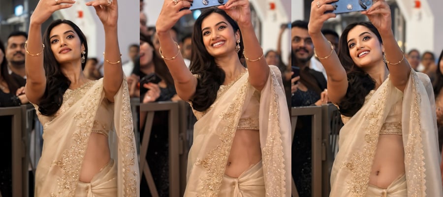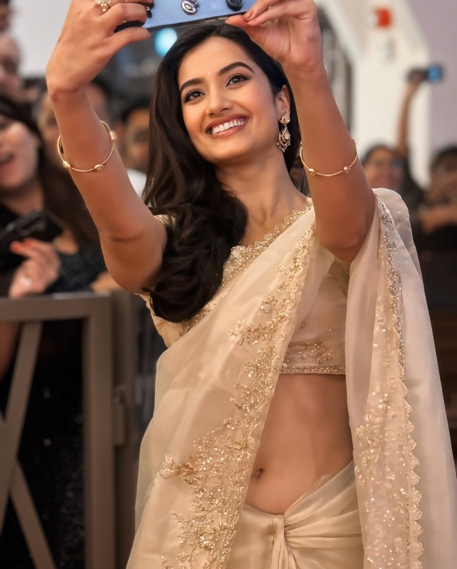 Bhagyashri Borse is living her most glamorous, unfiltered moment in these sizzling cream-and-gold saree shots — and yes, it comes with a deliciously unexpected “oops” twist. While attempting the perfect high-angle selfie, the actress raises both arms gracefully above her head,