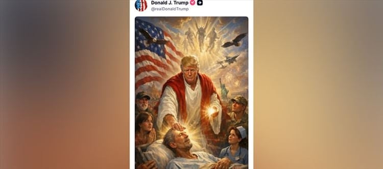 The image is pure shock value. Trump is shown in a Christ-like pose, complete with the kind of lighting and composition usually reserved for religious art. It’s not a meme someone else made — he put it out there himself.