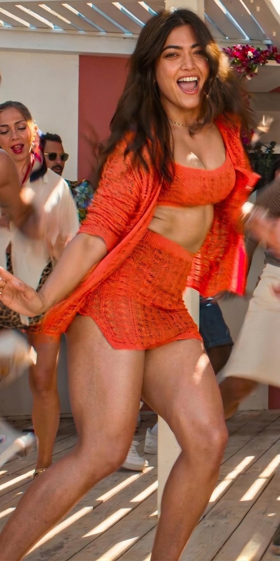 In the first image, she’s captured mid-dance on a wooden deck, wearing a bright orange crochet co-ord set with a matching crop top and