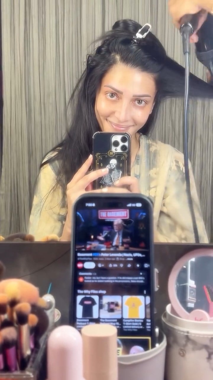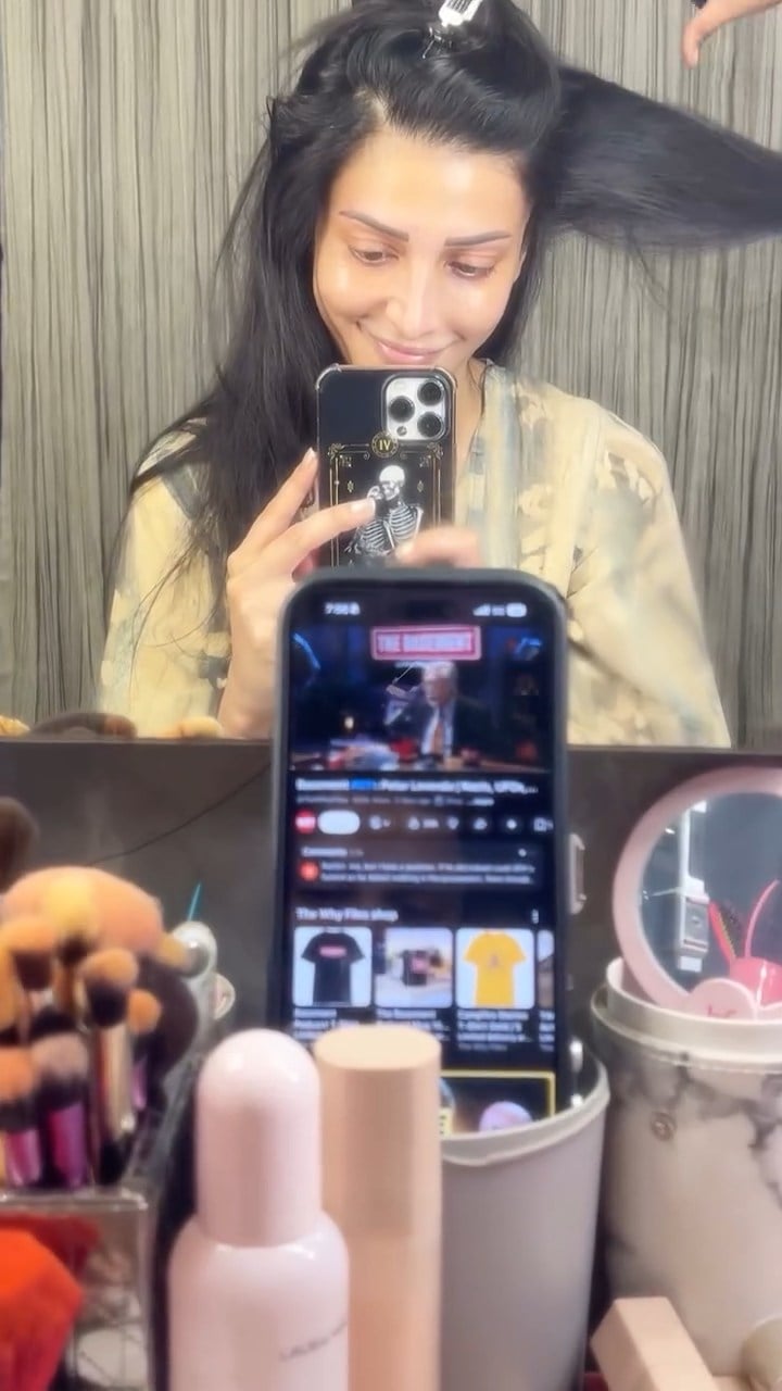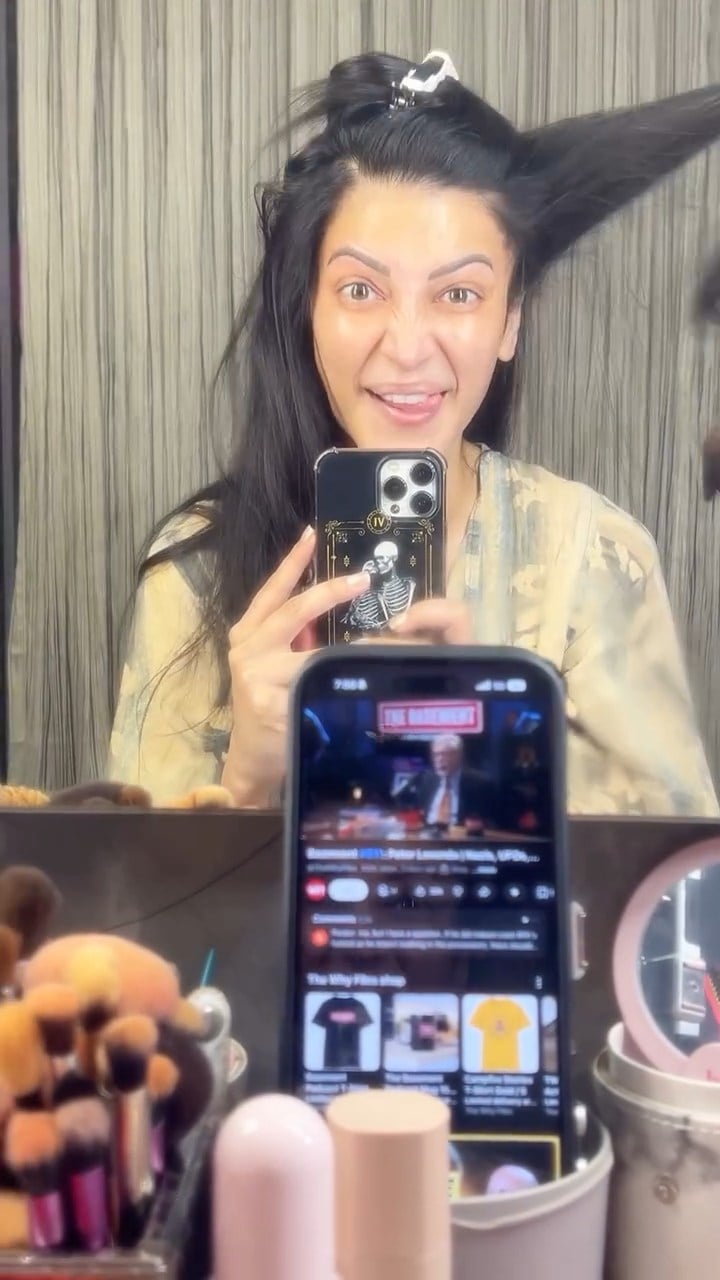 She’s wearing a casual printed robe, keeping things low-key yet stylish, while her signature bold brows and expressive eyes do all the talking. The foreground is filled with makeup brushes, beauty products, and another phone screen playing a video, giving these shots an intimate, behind-the-scenes feel.