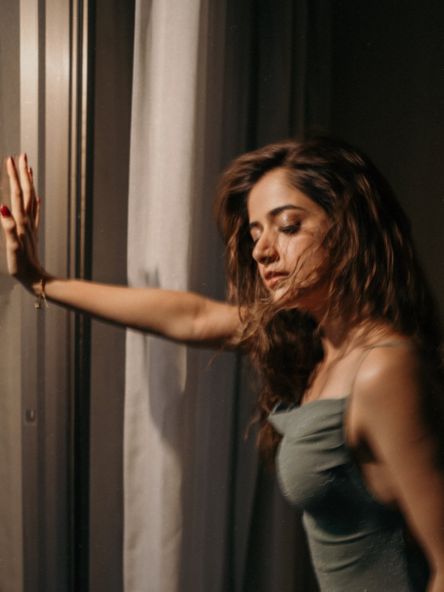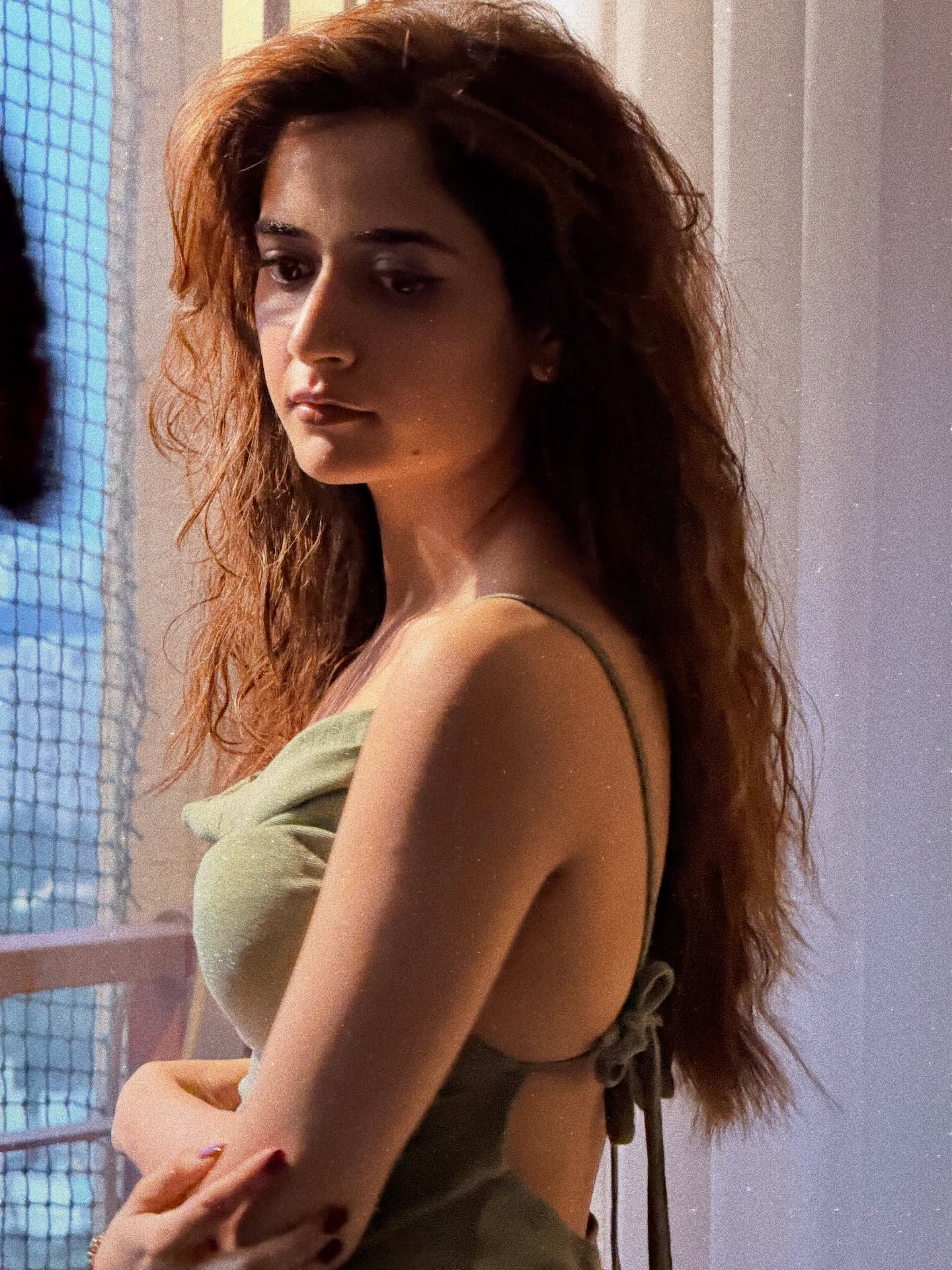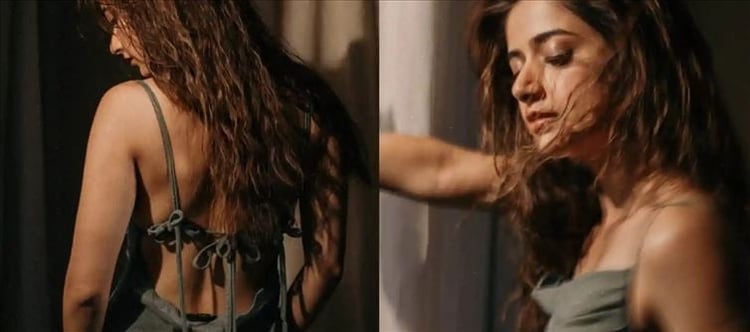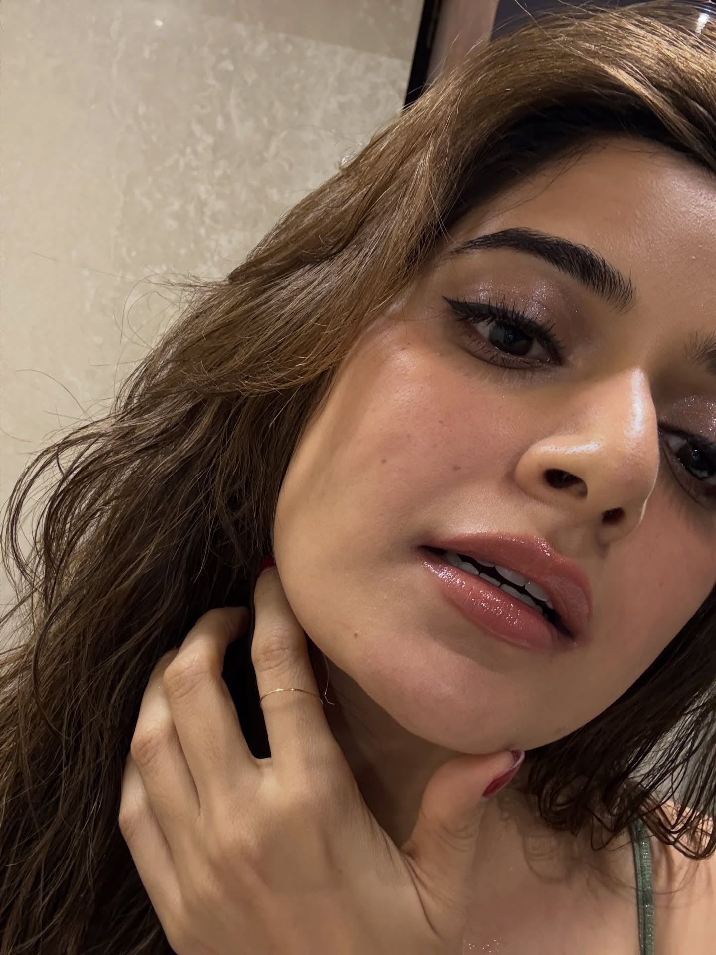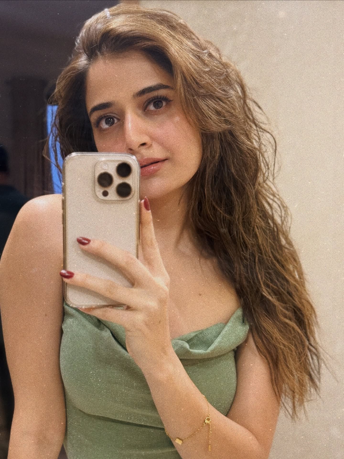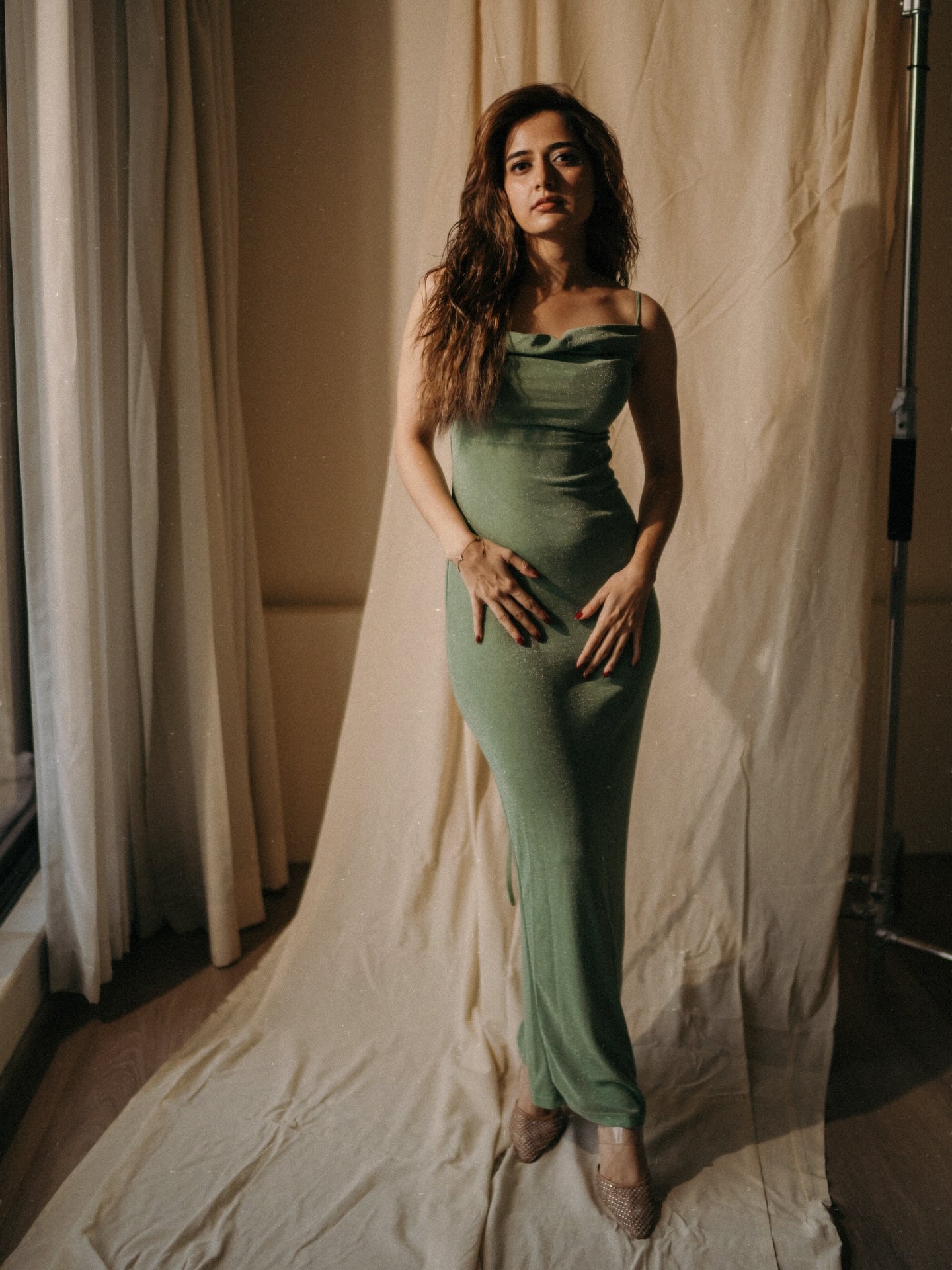 Draped in a sage green shimmer slip dress, Ashika isn’t just posing—she’s making a statement. The fit, the flow, the shine—it all works.