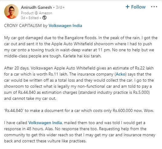 Anirudh Ganesh wrote, 'Due to the floods in Bangalore, my car got damaged. I took the car out in the middle of the rain and drove it to the apple Auto Whitefield showroom. Where I had to push my car in the waist on a towing truck. There was no one to help amidst deep water at 11 o'clock at night. We are strict middle-class people. Let's do it somehow.