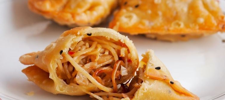 తరువాత కాస్త ఉప్పు, కార్న్ ఫ్లోర్ వేసి వేయించాలి. అవి వేగాక ఉడికించిన నూడుల్స్ ను వేసి కలపాలి. ఒక ఐదు నిమిషాలు నూడుల్స్ వేగాక ప్లేటులోకి తీసుకుని... తడి ఎక్కువ లేకుండా ఆరనివ్వాలి. ఇప్పుడు ముందుగా కలిపి పెట్టుకున్న పిండి ముద్దని చిన్న ఉండలుగా చేసుకుని పూరీల్లా ఒత్తాలి. పూరీని సగానికి కోసి త్రికోణాకారంలో మడతబెట్టి, లోపల నూడిల్స్ మిశ్రమాన్ని పెట్టి అంచులు మూసేయాలి.