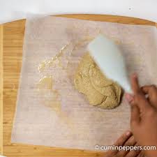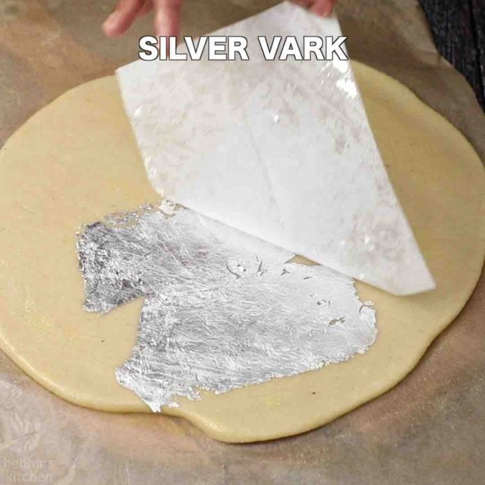 Place the dough between the butter paper and roll using a rolling pin. Remove the butter paper and apply silver vark and cut it into a diamond shape of your choice.