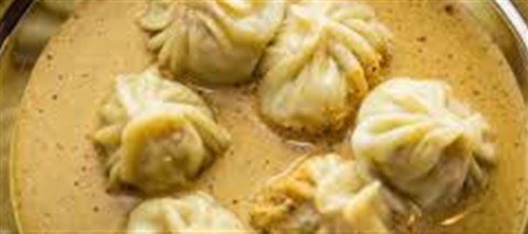 Pour the hot Jhol (soup) over the momos. The soup should cover the momos generously.