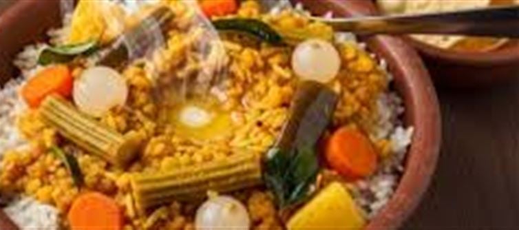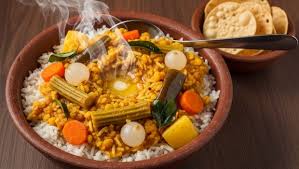 Sambar rice is a wholesome combination of cooked rice and sambar, a spicy lentil-based vegetable stew flavored with tamarind, spices, and curry leaves.