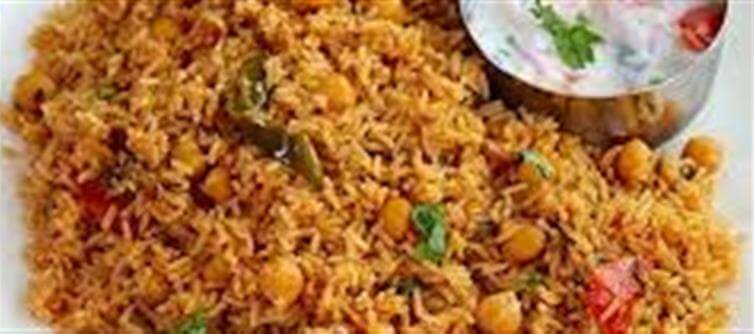 7. Layer Biryani: In a heavy-bottomed pot, layer half the chickpea masala and half the rice. Repeat layers.