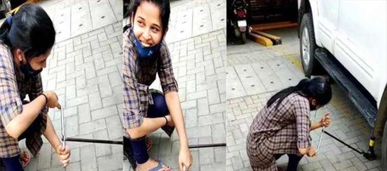 జిల్లా కలెక్టర్ ఏకంగా తన కారు టైర్ ను మార్చుకుంది. ఎవరి సహాయం లేకుండానే