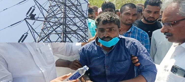 పాత రాజం పేట గ్రామానికి చెందిన పురుషోత్తం అనే వ్యక్తి గత నాలుగేళ్లుగా డ్రైవర్గా పని చేస్తున్నాడు. అయితే తమ గ్రామానికి చెందిన ముగ్గురు వ్యక్తులు కుట్రపూరితంగా వ్యవహరించి తనను విధుల నుంచి తొలగించేలా చేశారంటూ పురుషోత్తం ఆరోపిస్తున్నాడు. వెంటనే తనని వీధుల్లోకి తీసుకోవాలంటూ డిమాండ్ చేస్తూ ఇక ఏకంగా హైటెన్షన్ విద్యుత్ టవర్ ఎక్కి హల్ చల్ చేశాడు. ఇక సమాచారం అందుకున్న పోలీసులు సంఘటనా స్థలానికి చేరుకున్నారు. అతనికి నచ్చజెప్పే ప్రయత్నం చేసిన వినిపించకపోవడంతో ఇక అటువైపుగా వెళుతున్న ఆర్డీవో వచ్చి నచ్చజెప్పి న్యాయం చేస్తాను అంటూ హామీ ఇవ్వడంతో చివరికి టవర్ నుంచి కిందికి దిగాడు పురుషోత్తం.