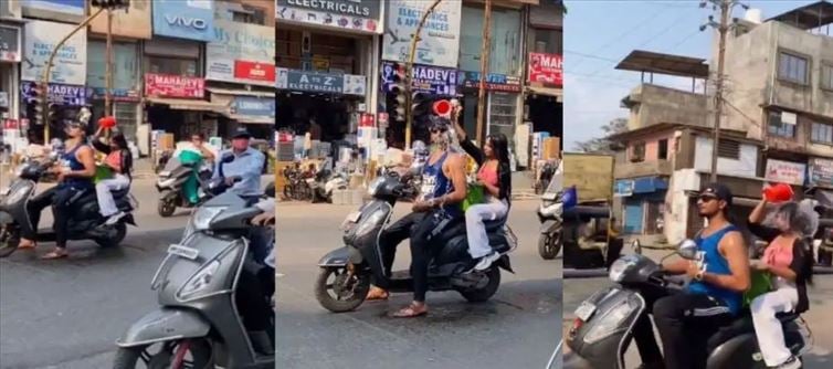 నాలుగు గోడల మధ్య చేయాల్సిన స్నానాన్ని.. నడిరోడ్డు మీద చేసేసింది ఆ జంట. ఇందుకు సంబంధించిన వీడియో కాస్త ట్విట్టర్ వేదికగా వైరల్ గా మారిపోయింది అని చెప్పాలి. మహారాష్ట్రలో ఈ ఘటన వెలుగులోకి వచ్చింది. తానే జిల్లా ఉల్లాస్ నగర్ లోని ట్రాఫిక్ సిగ్నల్ వద్ద ఒక జంట ఏకంగా స్కూటర్ పై వచ్చి సిగ్నల్ దగ్గర ఆగారు. అయితే యువతి తన వెంట తెచ్చుకున్న బకెట్ లోని నీటిని మగ్గుతో తీసి తన ముందు బైక్ నడుపుతున్న వ్యక్తి తల మీద పోస్తుంది. ఇక ఆ తర్వాత ఇక తన తలపై కూడా పోసుకుని స్నానం చేస్తున్నట్లుగా కవరింగ్ ఇచ్చింది. అయితే వాళ్ళు చేస్తున్న పని చూసి అక్కడ ఉన్న వారందరూ కూడా ఒక్కసారిగా షాక్ అయ్యారు అని చెప్పాలి.
