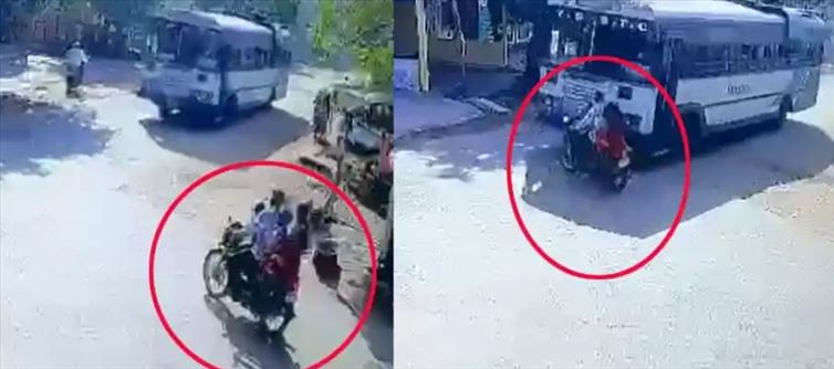 ఇక అదే సమయంలో చౌరస్తా వద్ద రోడ్డు దాటే ప్రయత్నం చేశాడు. అయితే అప్పటికే అటువైపుగా వేగంగా దూసుకు వస్తుంది ఆర్టీసీ బస్సు. మరోవైపు నుంచి బైకర్ కూడా దూసుకు వచ్చాడు. అయితే బస్సును గమనించకుండా ఇక అలాగే రోడ్డు మీదికి వెళ్ళాడు. దీంతో ఈ విషయాన్ని గమనించిన బస్సు డ్రైవర్ ఒక్కసారిగా బ్రేకులు వేశాడు. కానీ అప్పటికే వేగంగా ఉన్న బస్సు ఆగలేదు. ఇక ముందుకు వచ్చిన బైకర్ ను ఢీ కొట్టింది. ఈ ప్రమాదంలో ఇద్దరు చిన్నారులు అక్కడికక్కడే ప్రాణాలు వదిలారు. భార్య, భర్తలు తీవ్రంగా గాయపడ్డారు. ఈ వీడియో సీసీటీవీలో రికార్డ్ అయ్యింది అని చెప్పాలి.