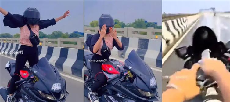 ఆ యువతి చేసిన విన్యాసాలు చూసి నేటిజన్స్ అందరు కూడా షాక్ లో మునిగిపోతున్నారు అని చెప్పాలి. బీహార్ రాజధాని పాట్నాకు చెందిన హంటర్ క్వీన్ అనే యువతి వీడియో వైరల్ గా మారింది. ఇందులో మహిళా బైకర్ మెరైన్ డ్రైవ్ స్టంట్ చేస్తూ ఉండటం చూడవచ్చు. అయితే వీడియోలో ఆమె హైవేపై అత్యంత వేగంగా బైకు నడుపుతూ ఇక హ్యాండిల్ ను కూడా రెండు చేతులతో వదిలేసింది. ఆ తర్వాత బైక్ ని ఇష్టం వచ్చినట్టుగా నడుపుతూ ప్రయాణించింది. ఇక ఆ యువతి అంత వేగంగా బైక్ పై వెళ్తున్నప్పుడు ఏ మాత్రం తేడా జరగిన.. చివరికి ప్రాణాలు గాల్లో కలిసిపోతాయ్. అయినప్పటికీ ఇలాంటి రిస్కీ స్టంట్స్ చేసింది యువతి.