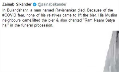 ഈ അവസരത്തിലാണ് തൊട്ടടുത്ത് താമസിക്കുന്ന മുസ്ലിം യുവാക്കൾ മൃതദേഹം സംസ്കരിക്കാൻ മുമ്പോട്ട് വന്നത്. ഏറ്റവു കൂടുതൽ വർഗീയ പരാമർശങ്ങളും ഏറ്റുമുട്ടലുകളും നടക്കുന്ന ഉത്തർപ്രദേശിലെ ബുലന്ദ്ശഹറിൽ നിന്നുള്ള ഈ വീഡിയോ സമൂഹ മാധ്യമങ്ങൾ ഏറ്റെടുത്തിരിക്കുകയാണ്.