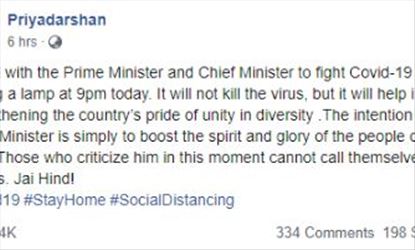 ദീപം തെളിച്ചാൽ വൈറസ് ചാകില്ല, പക്ഷേ ഇന്ത്യയുടെ നാനാത്വത്തിൽ ഏകത്വത്തിൽ അഭിമാനം കൊള്ളുവാനുള്ള അവസരമാണ്. പ്രധാനമന്ത്രിയെ വിമര്ശിക്കുന്നവര്ക്ക് സ്വയം ദേശസ്നേഹികളെന്ന് വിളിക്കാന് അവകാശമില്ലെന്നു അദ്ദേഹം ഫേസ്ബുക്ക് പോസ്റ്റില് പറഞ്ഞിട്ടുണ്ട്. അതായത് ഇപ്പോഴിതാ ഈ തീരുമാനത്തെ പിന്തുണച്ച് സംവിധായകന് പ്രിയദര്ശനും എത്തിയിരിക്കുകയാണ്.