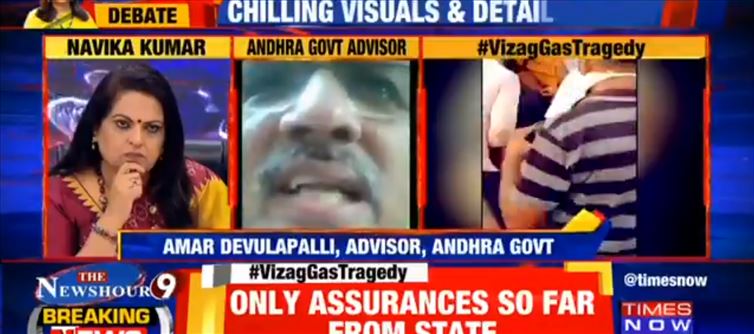 ఇప్పుడిదంతా ఎందుకంటే టైమ్స్ నౌ ఛానల్లో విశాఖపట్నం గ్యాస్ ప్రమాదంపై చర్చ జరిగింది. గురువారం తెల్లవారుజామున గ్యాస్ ప్రమాదం జరిగితే అదే రోజు రాత్రి 9.30 గంటలకు డిబేట్ జరిగింది. డిబేట్ లో యాంకర్ నావికా కుమార్ తో ప్రభుత్వ సలహాదారు దేవులపల్లి అమర్ పాల్గొన్నాడు. నావికా మాట్లాడుతూ ప్రమాధ ఘటనపై ప్రభుత్వం నియమించిన హై పవర్ కమిటి నివేదిక ఎప్పటికి వస్తుంది ? అని ప్రశ్నించింది.