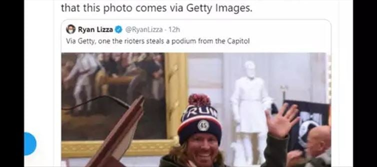 ട്രംപ് എന്ന്നെഴുതിയ തൊപ്പിയും ധരിച്ച് ക്യാമറയ്ക്ക് മുൻപിൽ കൈ വീശി, ചിരിച്ചാണ് യുവാവ് പൊടിയാവുമായി കടന്നു കളയാൻ ശ്രമിക്കുന്നത്. ഈ ചിത്രം പോസ്റ്റ് ചെയ്ത റയാൻ ലിസ ഒപ്പം എഴുതിയത് ഇങ്ങനെ "Via Getty, one the rioters steals a podium from the Capitol".പൊളിറ്റിക്കോയുടെ ചീഫ് വാഷിംഗ്ടൺ കറസ്പോണ്ടന്റ് ആയ റയാൻ ലിസ ട്വിറ്ററിൽ ഒരു ചിത്രം പോസ്റ്റ് ചെയ്തു. കലാപകാരികളിൽ ഒരാൾ കാപ്പിറ്റോളിൽ നിന്ന് ഒരു പോഡിയം മോഷ്ടിക്കുന്നു', എന്നാണ് ട്വീറ്റിന്റെ രണ്ടാം ഭാഗത്തിന്റെ അർഥം. Via Getty സൂചിപ്പിക്കുന്നത് ഈ ചിത്രം താൻ പോസ്റ്റ് ചെയ്തിരിക്കുന്നത് Getty Images എന്ന ഏജൻസിയുടെ ഫോട്ടോ ആണ് എന്നുള്ളതാണ്. പക്ഷെ പണി പാളി, ട്വീറ്റ് വായിച്ച പലരും ധരിച്ചത് ചിത്രത്തിൽ കാണുന്ന യുവാവിന്റെ പേരാണ് വയ ഗെറ്റി എന്നാണ്. ഇതോടെ വയ ഗെറ്റി എന്ന് പേരുള്ള ഈ യുവാവിനെ എത്രയും പെട്ടന്ന് അറസ്റ്റ് ചെയ്യണം എന്ന ആവശ്യവുമായി ട്വീറ്റുകൾ പ്രത്യക്ഷപ്പെടാൻ തുടങ്ങി.