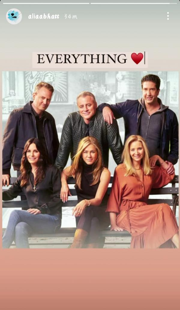 Surprisingly, whether a celebrity or a commoner, everyone feels the same way. bollywood actress alia bhatt is excited about the upcoming premiere of Friends: The Reunion and can't stop smiling. alia bhatt rushed to her instagram account to express her joy over the news, posting a photo of the cast of Friends: Jennifer was all hearts for this magnificent moment, which included Jennifer, Courteney, Lisa, Matt, Matthew, and David posing together. alia captioned the photo with the word "Everything" and a heart emoji. Earlier even the mumbai police have used the announcement of friends series in a sarcastic way to warn people to stay in their home during this lockdown.