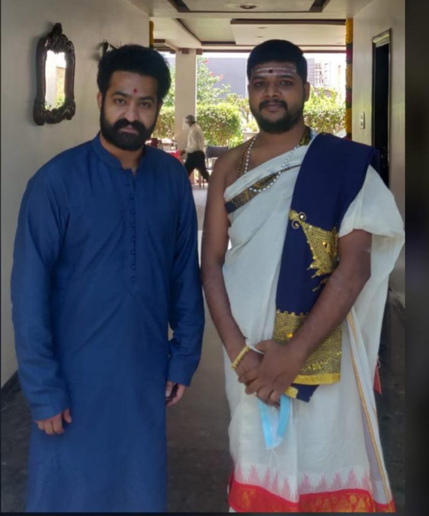 The Aksharabhyaasam celebration for nandamuri Bhargav ram, Jr NTR's younger son, was held on Sunday, according to the latest reports. Tarak's home in jubilee hills hosted a private function. junior NTR's photo at the Aksharabhyaasam ceremony is currently trending on social media. The event was completely traditional, with all hindu customs observed. Fans have uploaded a photo of ntr with Poojari on social media. ntr looked dashing and suave in a blue kurta and dhoti.