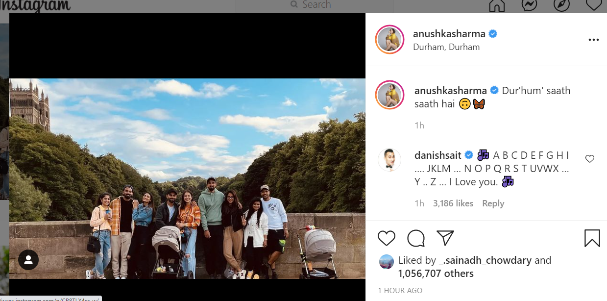 KL rahul, a cricketer, tweeted a snapshot of anushka sharma and athiya shetty posing as photographers for the cricketers earlier today. anushka Sharma's family is shown with KL rahul, athiya shetty, Ishant Sharma, his wife Pratima Singh, Umesh Yadav, and his wife Tanya Wadhwa in Anushka's instagram photo. Currently, they are in Durham, England. "Dur'hum' saath saath hai (sic)," anushka captioned the photo.