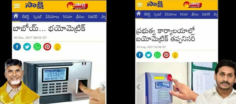 కానీ.. ఇదే సాక్షి గతంలో ఇదే నిర్ణయం చంద్రబాబు సర్కారు తీసుకున్నప్పుడు ఉద్యోగులను భయపెట్టే ప్రయత్నం చేసింది. భయోమెట్రిక్ అంటూ భయపెట్టింది. బయో మెట్రిక్ కారణంగా ఉద్యోగులకు ఇబ్బందులు అంటూ రాసుకొచ్చింది. అంటే విపక్షంలో ఉంటే ఒకవిధంగా.. అధికారంలో ఉంటే మరోవిధంగా.. అందుకే ప్రతి నాయకుడూ సొంత మీడియా ఉండాలని తెగతాపత్రయపడుతున్నారు.