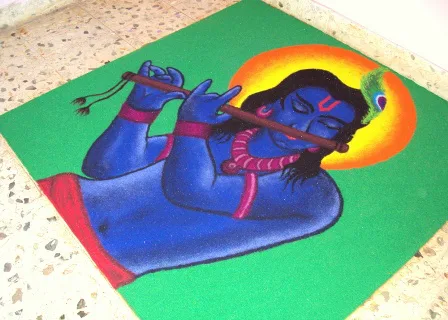 This rangoli creation, which features the Lord himself, is quite lovely. The background colour is a mild sea-green that works well as a basis. Krishna's inner body is a softer shade of blue, but his outline is a much darker shade of blue. He also has a sun-like pattern behind his head and a peacock feather in his skull.