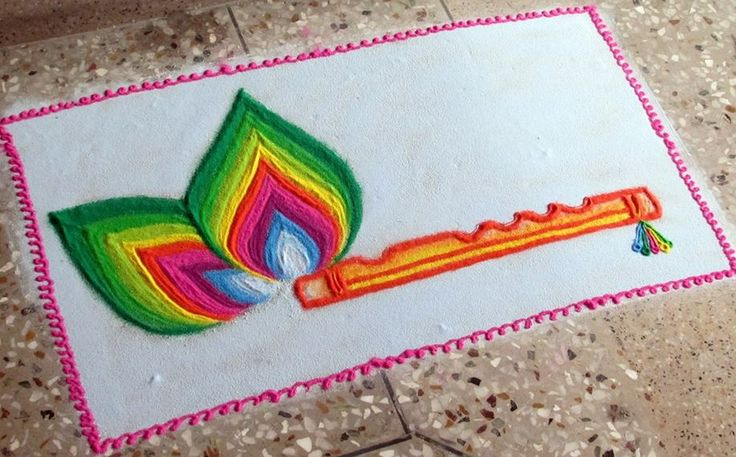 The flute of Lord krishna is a simple and lovely idea for this celebration. It's paired with two peacock feather designs to complete the look. The feathers come in a variety of colours and are layered one on top of the other. Many people may struggle to fill smoother layers of colour.