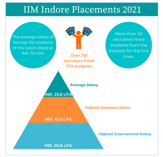 A total of 572 students were present in the placement program of IIM Indore. The top 100 students have got an average package of Rs 37.9 lakh per annum. On the other hand, students in the top 200 have been offered an average annual package of Rs 32.7 lakh. The highest package offered on the campus is Rs 49 lakh.