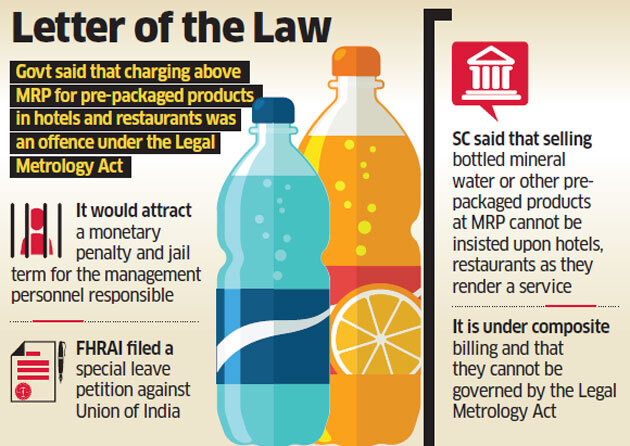 As per the supreme court ruling in 2017, restaurant and hotel owners are not bound by the maximum retail price or MRP in the case of packaged food or beverages. The government was the respondent in this case while the petition was filed by the Federation of Hotel and Restaurant Associations of india (FHRAI). The government said that selling pre-packaged food items at more than the MRP is a legal offense, which can lead to a fine of Rs 25,000 or a jail term.