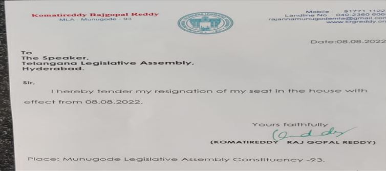 ప్రాజెక్టులు కట్టొద్దని మేము చెప్పలేదన్న కోమటి రెడ్డి రాజగోపాల్ రెడ్డి .. లక్ష రుణ మాఫీ ఏమైందని ప్రశ్నించారు. వరి కొనలేమని చేతులు ఎత్తేశారని.. మిషన్ భగీరథలో 25వేల కోట్లు దోచుకున్నది నిజం కాదా.. జీతాలు ఇవ్వాలంటే అప్పు చేయాల్సిన పరిస్థితి వచ్చిందని.. టీఆర్ఎస్ తెలంగాణ ద్రోహుల పార్టీగా మారిందని.. గంగుల, ఎర్రబెల్లి, తలసాని, పువ్వాడ అజయ్ ఉద్యమకారులా అంటూ కోమటి రెడ్డి రాజగోపాల్ రెడ్డి ప్రశ్నించారు. తెలంగాణలో ప్రజా స్వామ్యం లేదన్న కోమటి రెడ్డి రాజగోపాల్ రెడ్డి .. స్పీకర్ నా రాజీనామ ఆమోదిస్తారు అనుకుంటున్నానన్నారు. మరి ఈ రాజీనామాను పోచారం ఏం చేస్తారో? ఆమోదిస్తే మరో రాజకీయ సమరం తప్పదు.
