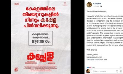 ടു സ്റ്റേറ്റ്സ്, കപ്പേള തുടങ്ങിയ ചിത്രങ്ങൾ തീയേറ്ററുകളിൽ നിന്ന് ഒഴിയുകയാണെന്ന് ചിത്രത്തിൻ്റെ അണിയറപ്രവർത്തകർ വ്യക്തമാക്കി. സോഷ്യൽ മീഡിയയിലൂടെയാണ് തങ്ങളുടെ ചിത്രങ്ങൾ തീയേറ്ററുകളിൽ നിന്ന് പിന്മാറുന്നതായി വ്യക്തമാക്കിയത്.